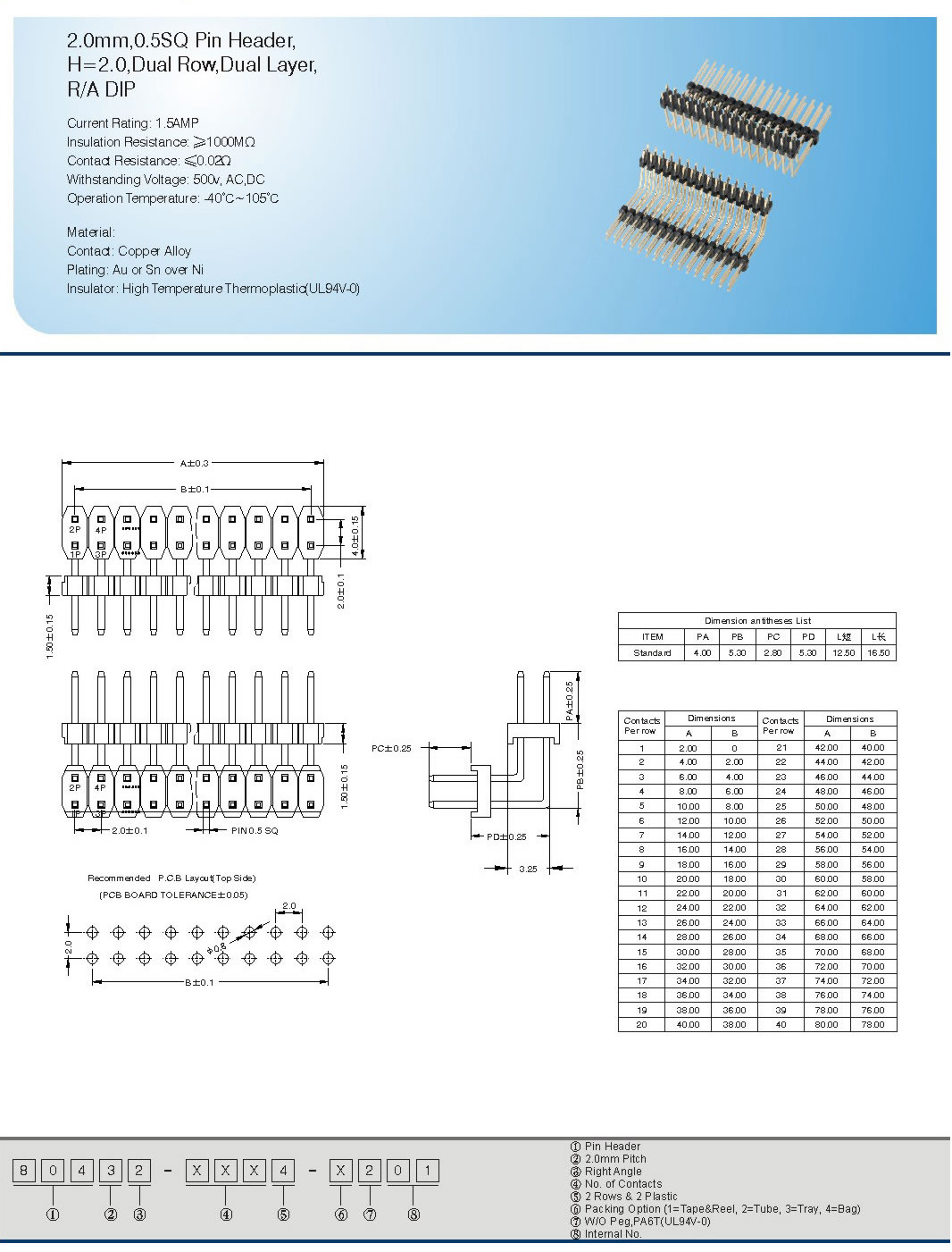 2.0mm,0.5SQ Pin Header,