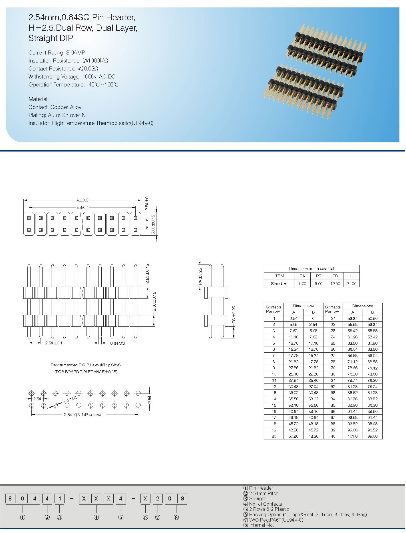 2.54mm,0.64SQ Pin Header,